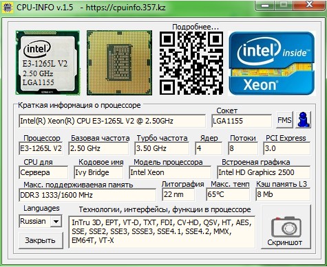Процессор для серверного компьютера E3-1265L V2, имеет кодовое имя Ivy Bridge, относится к поколению Xeon.