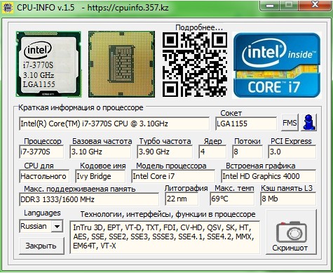 Процессор для настольного компьютера i7-3770S, имеет кодовое имя Ivy Bridge, относится к поколению Core i7.